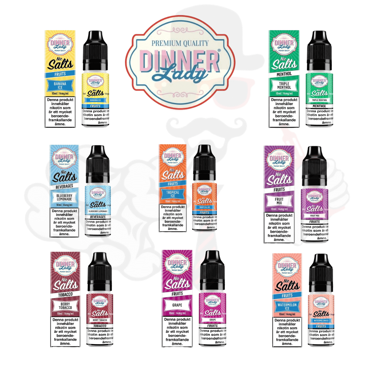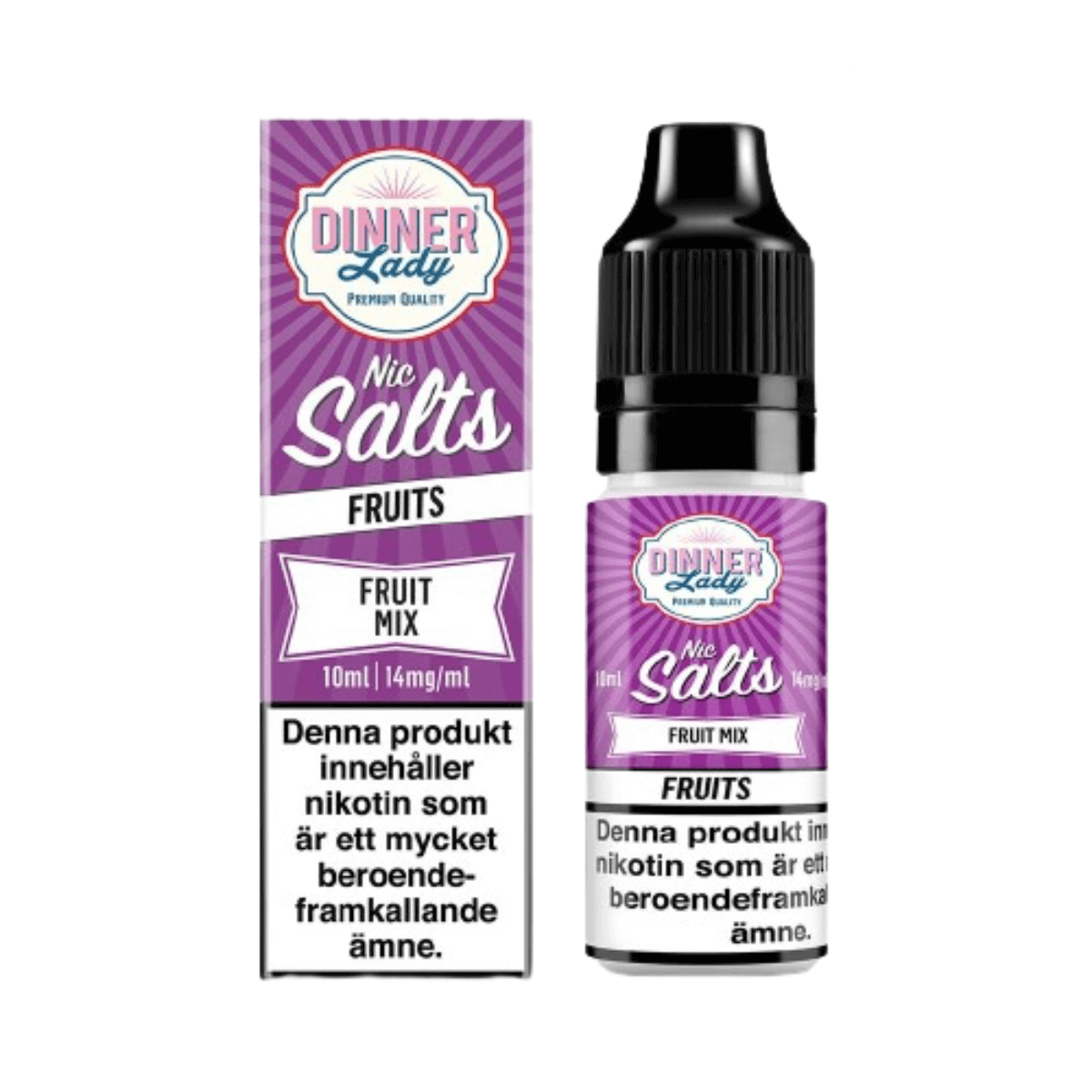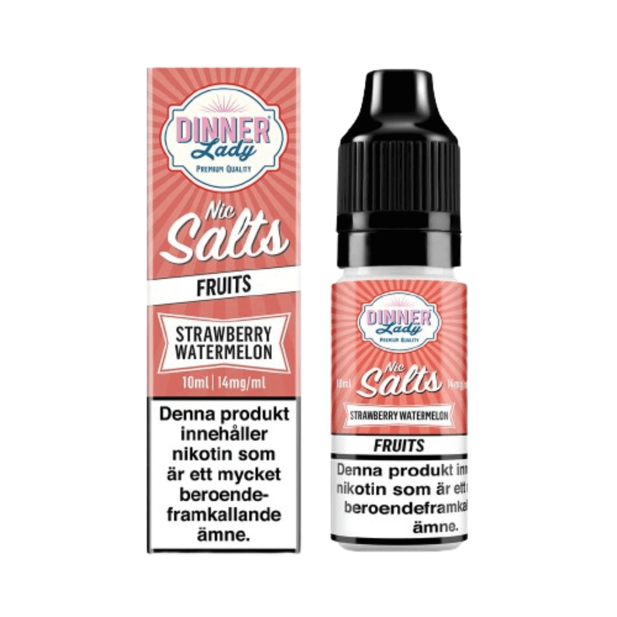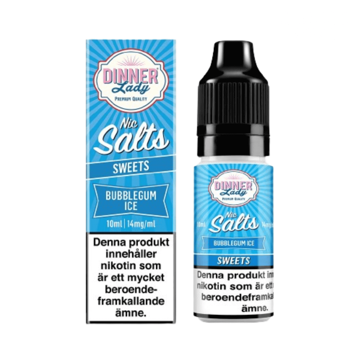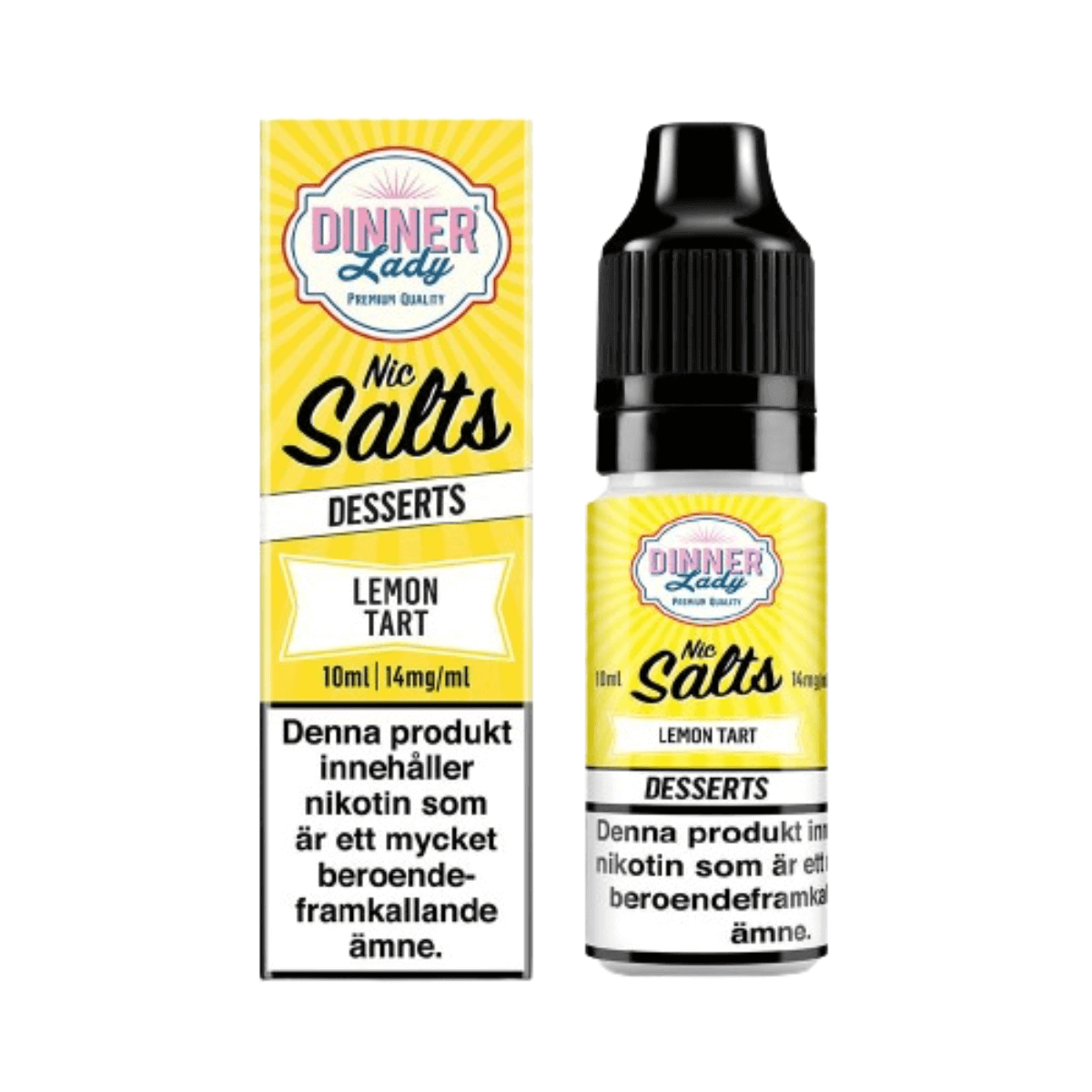 Dinner Lady Salt från UK kommer i 14 smaker och innehåller 14 mg/ml nikotinsalt, e-juice med saltnikotin används främst i pod system och mindre startkits för MTL användning.